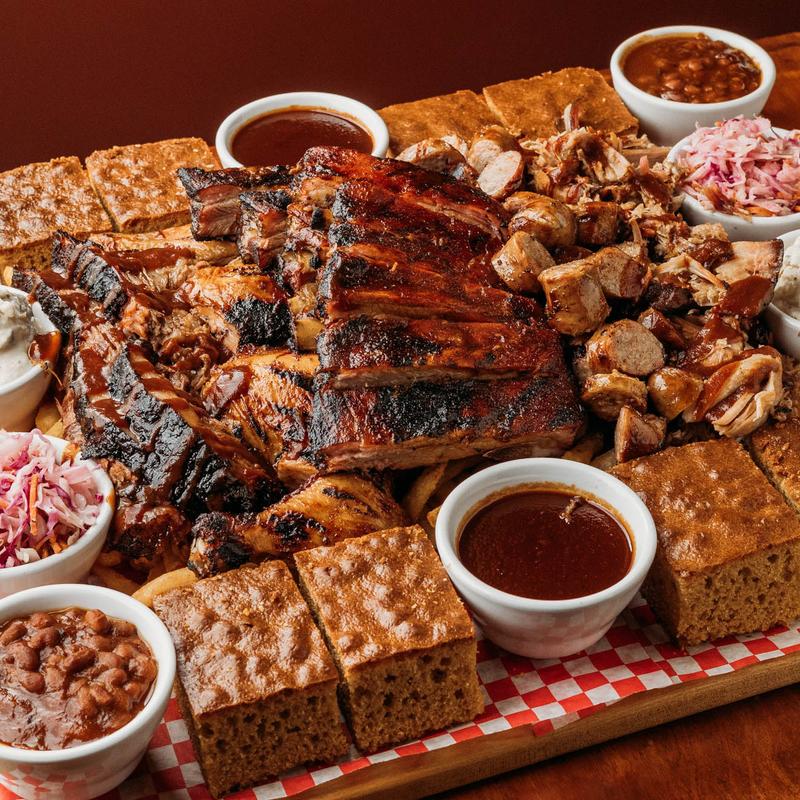 Feeds 8 people • 1 lb brisket, 1 lb pulled pork, 1 full rack of ribs, 2 chicken leg and thigh, 3 sausages, 1 large fries, 4 large sides & 8 cornbread.